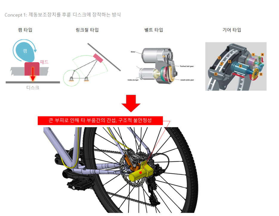무엇보다 제동장치의 크기와 무게가 관건이었는데요, 일단 모터 및 기어 사양 결정하고 가능한 최소크기를 자전거 뒷 바퀴에 가상으로 달아보았습니다.(위 그림의 하단)