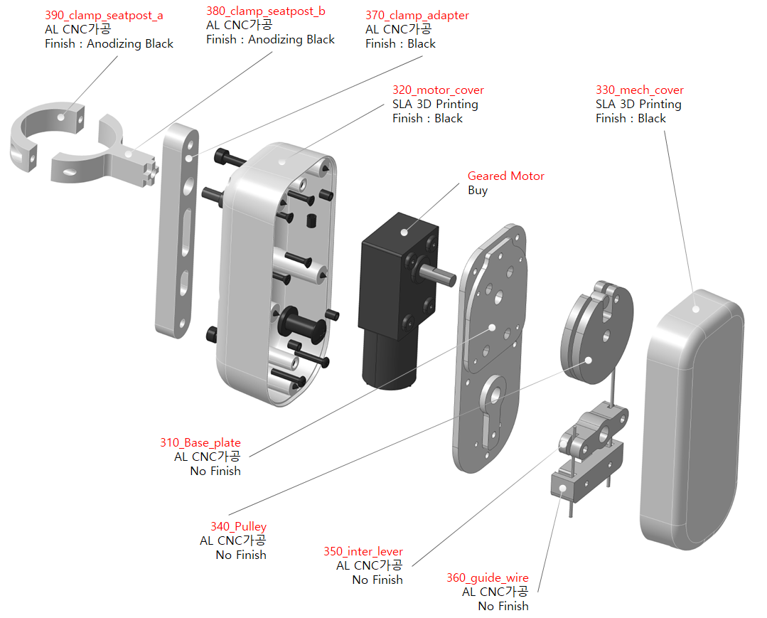 위에 보여드린 Concept 1은 와이어로 연결된 도르래를 기어드 모터가 감아 올리는 방식입니다. 작은 힘이 들도록 별도의 기어를 추가할 필요 없이 기어비가 높은 모터를 사용하고 와이어가 흔들리지 않도록 가이드 역활을 하는 부품으로만 구성되어 있습니다. 아주 간단하죠.